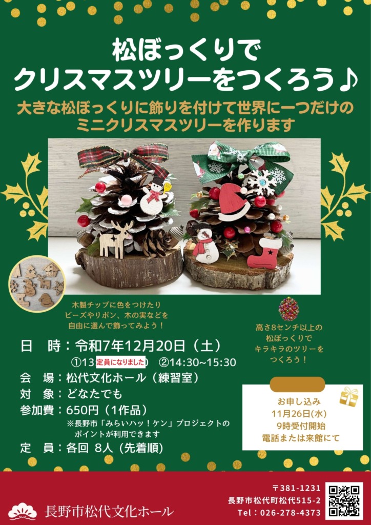 「松ぼっくりでクリスマスツリーをつくろう」(12月20日開催)の13時からの回は定員になりました。14時30分からの回はまだ若干ご案内できます。