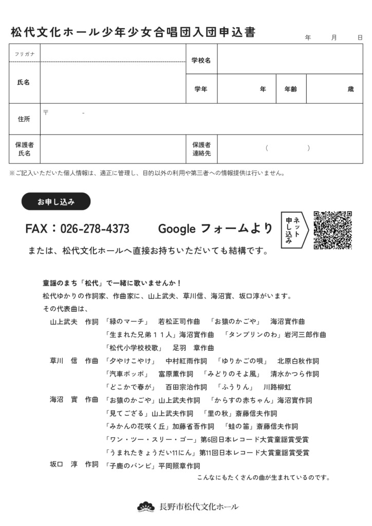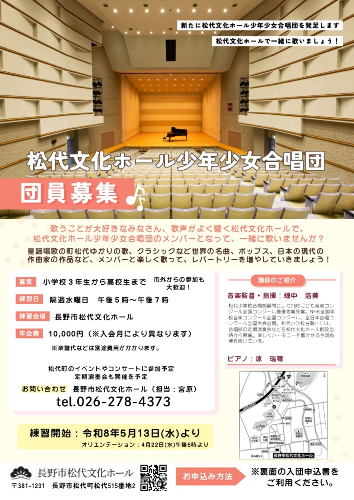 松代文化ホールでは、新たに「松代文化ホール少年少女合唱団」の活動を開始します。歌うことが大好きなみなさん、合唱団のメンバーとなって一緒に歌いませんか。参加ご希望のかた、お申し込みをお待ちしています。
